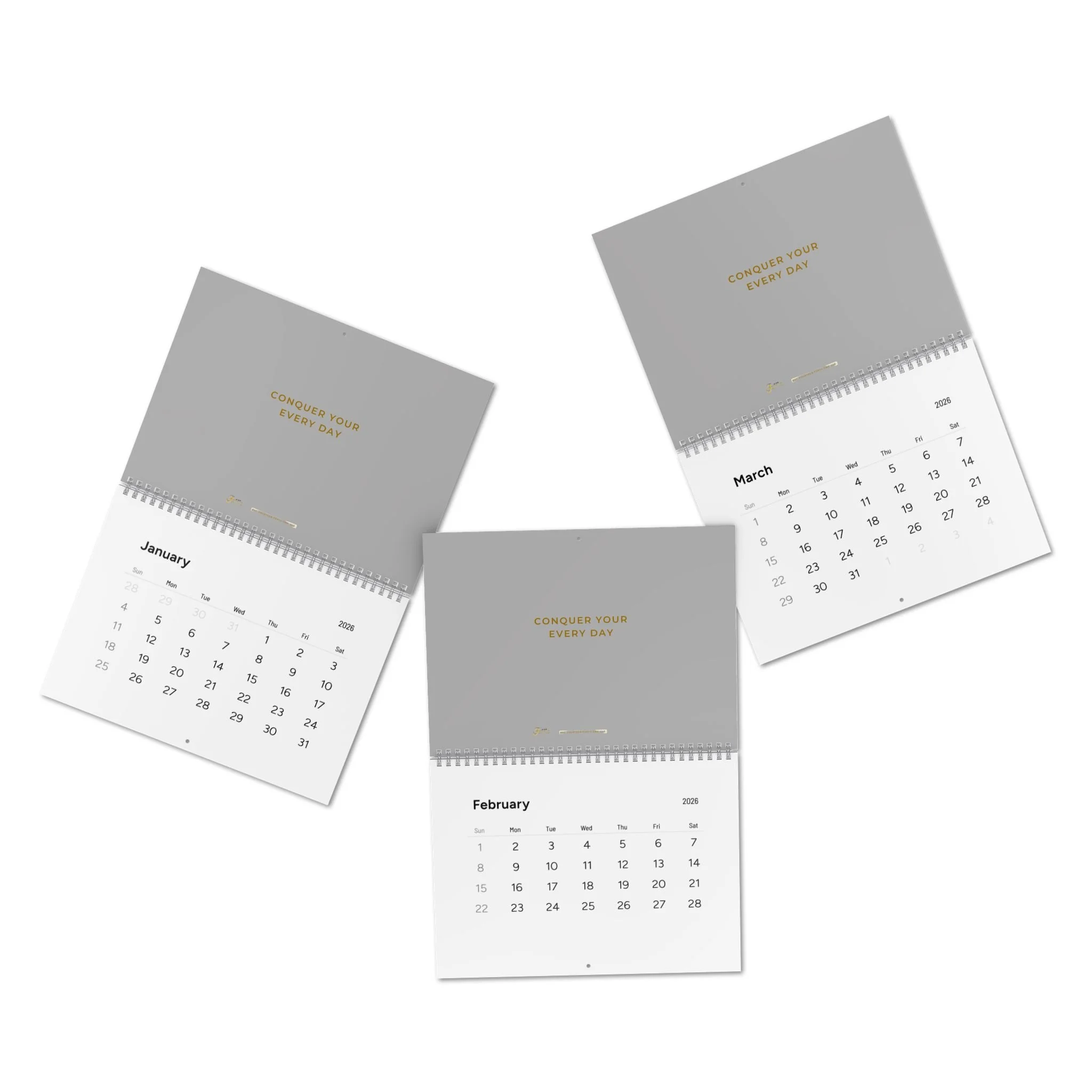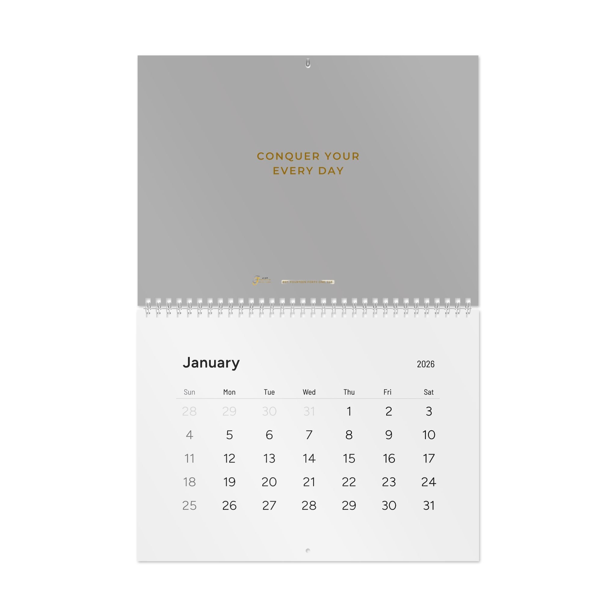 Stay organized and inspired with this gray/grey 2026 Calendar by Est. Fourteen Forty-One, LLC. Conquer Your Every Day tasks at work, school, and home with this planning and organization tool. Perfect for professionals, students, and busy individuals looking to stay on top of their schedules. Relevant to New Year celebrations and back-to-school season. Ideal for busy individuals, families, or anyone looking to add a splash of creativity to their home or office. This calendar is an excellent gift for the New Year, holidays, or any celebration that calls for new beginnings. Whether for personal use or as a thoughtful present, it’s functional art that inspires productivity and positivity throughout the year.