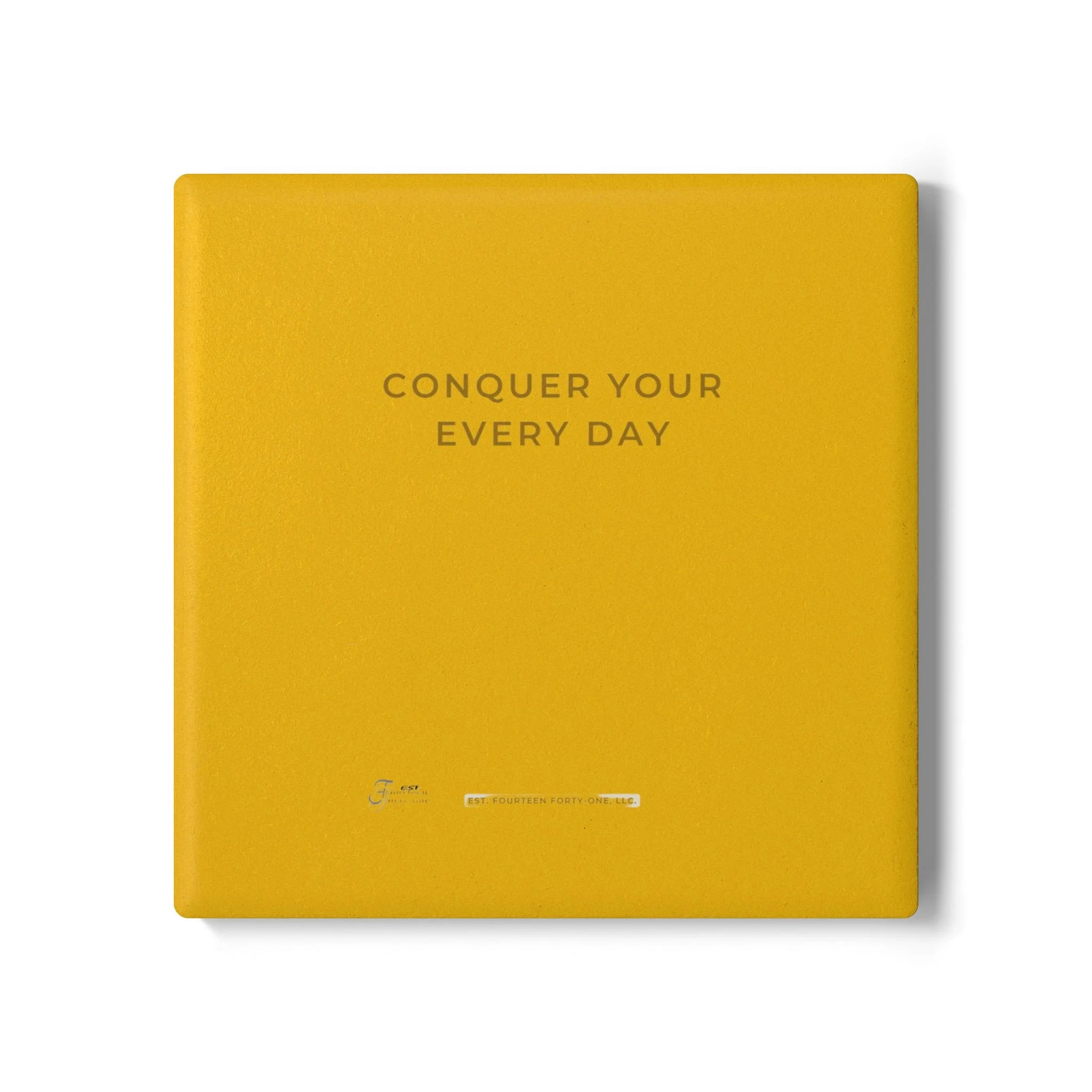 Yellow/Gold Motivational ceramic coaster by Est. Fourteen Forty-One, LLC. to Conquer Your Every Day tasks, perfect for enjoying a cup of tea or coffee. Ideal for those seeking daily inspiration and productivity boost. Suitable for hot or cold drinks, with a non-slip cork backing.